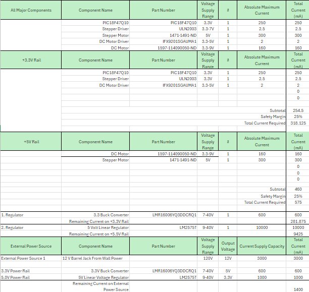 I used the power budget in order to estimate how much power the system would be pulling if it was using all of its capability at once. This way, I could plan accordingly as I designed by PCB and ordered fuses. The final current draw, 1400 mA, seems high but it would only reach this number if both motors were running at full speed. Since I knew that the system should never exceed 1400 mA, I ordered a 1.5 A fuse to protect the circuit in case of a short.